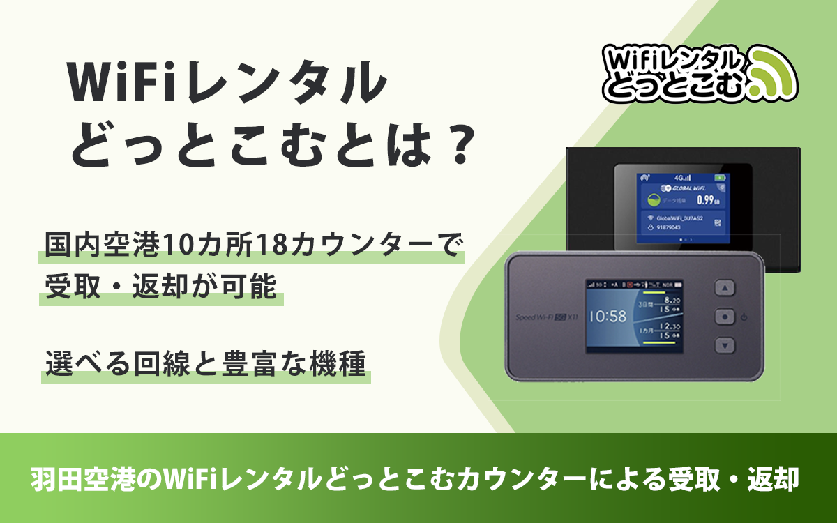WiFiレンタルどっとこむは、国内WiFiレンタル業界最大手のブランドです。宅配だけでなく、国内主要空港での受取・返却ができるので、出張や旅行、一時帰国の際にも大変便利です。